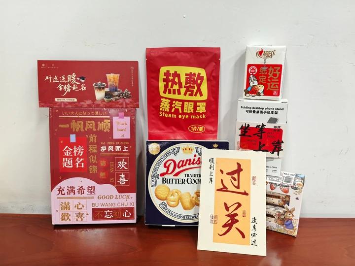 学院为考研学子精心准备了“易如反掌”考研大礼包,礼包内的每一份礼品都寄托着美好的寓意:“纸定高分”纸巾承载着下笔有神、高分稳拿的期许;“坐等上岸”支架助力同学们高效复习、轻松备考;“属你最牛”牛轧糖为备考时光增添甜蜜滋味;“取得头筹”曲奇祝愿大家考场夺魁、金榜题名;“一帆风顺”笔记本则陪伴同学们记录最后冲刺的点滴。一份份满载心意的礼包,一句句温暖有力的叮嘱,让同学们深切感受到学院的浓浓关怀。