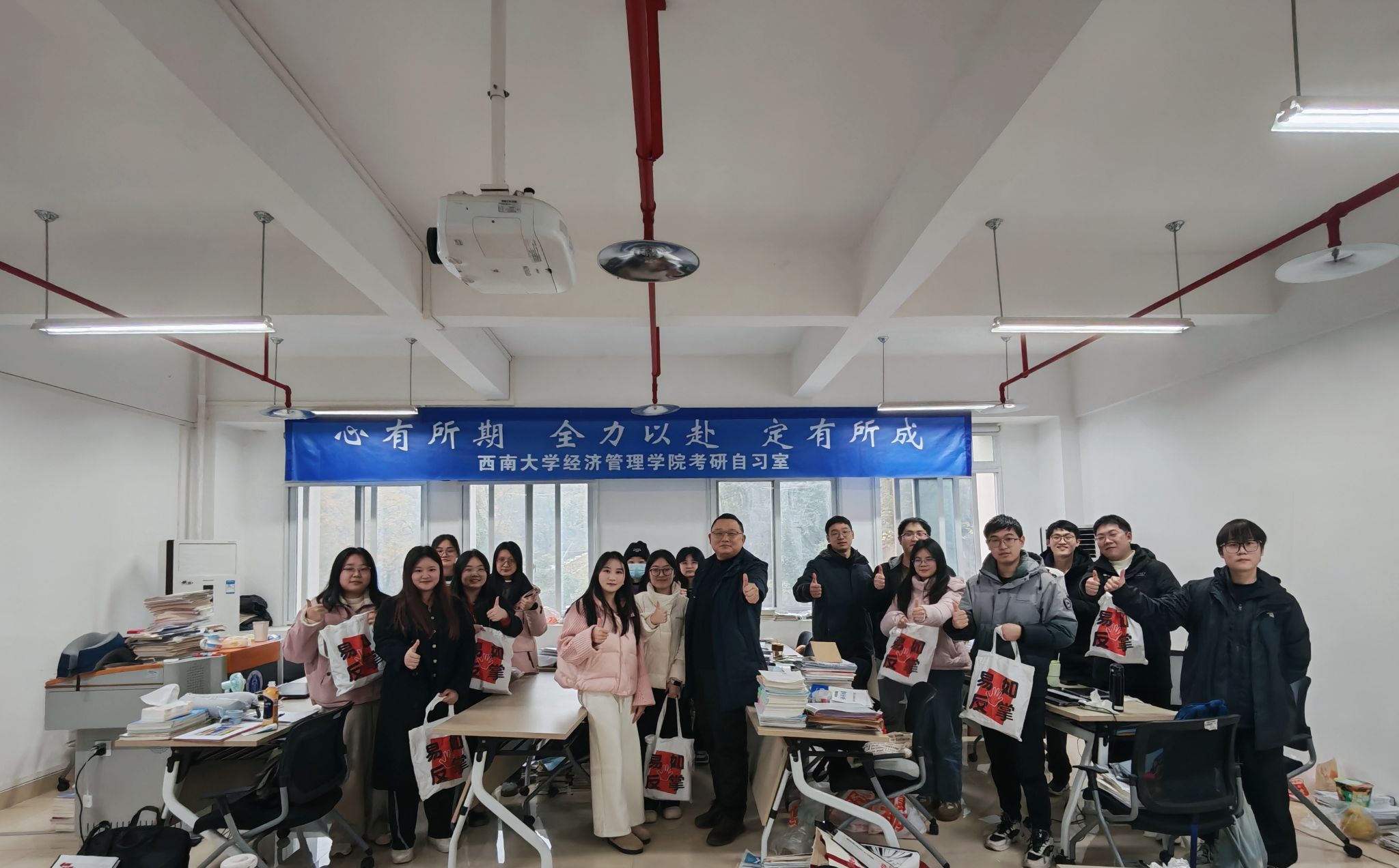12月16日,在2026年全国硕士研究生招生考试倒计时之际,经济管理学院党委副书记李玉胜同志带领大四辅导员罗浩准老师、宁霞老师深入学院考研自习室开展“研途送暖·助力圆梦”慰问活动,为全力备考的学子送上定制版“易如反掌”考研加油礼包,传递学院的深切关怀与殷切期望。