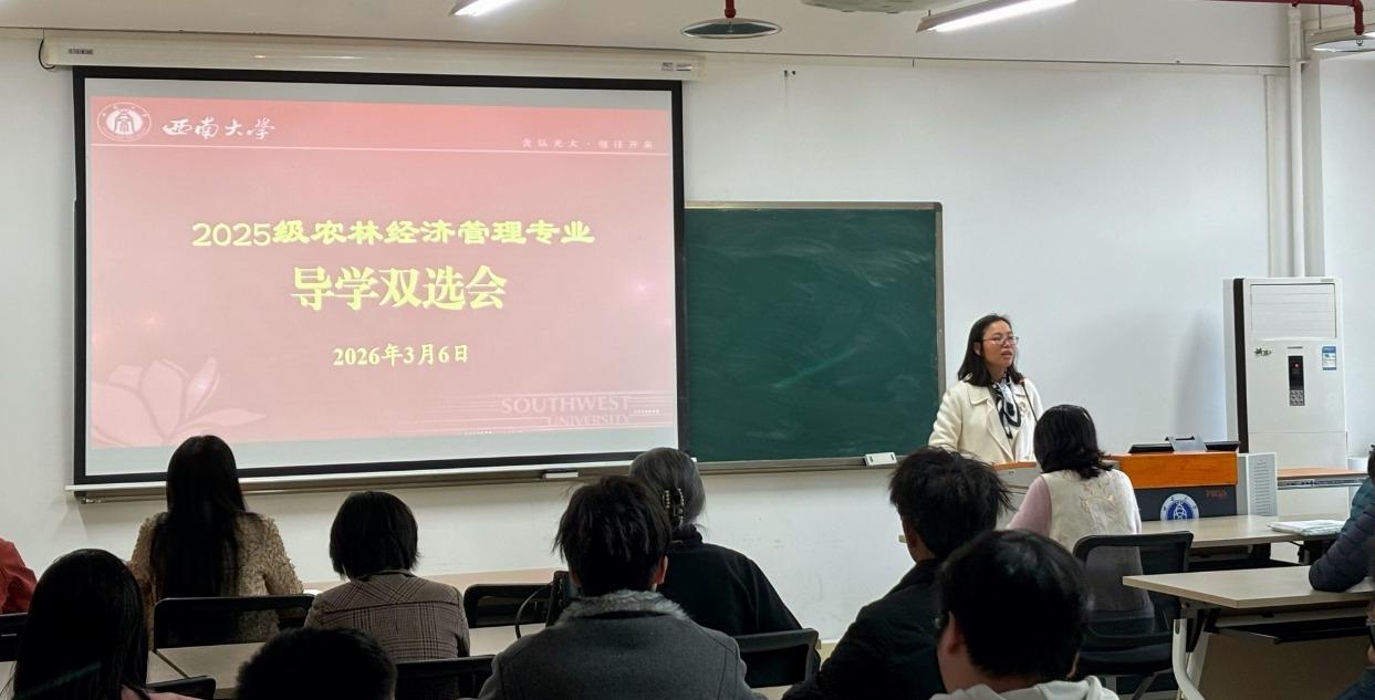 2026年3月6日,西南大学经济管理学院2025级农林经济管理专业导学双选会在热烈的氛围中顺利举办。系主任高静教授主持会议,15名专业教师和38名学生齐聚现场。此次专业导学双选会搭建起本科生与导师间的专属沟通桥梁,是专业深耕本科培养、强化师生协同育人的重要举措。农林经济管理专业作为学校特色优势学科之一,坚持以服务“三农”为使命,依托区域资源优势,持续推进教学改革与人才培养模式创新。本次导学双选会的举办,正是专业落实“教学相长、学以致用”培养目标的生动实践。