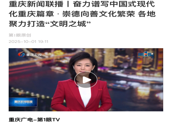 2025年10月1日,重庆广电-第1眼TV播出题为《重庆新闻联播丨奋力谱写中国式现代化重庆篇章 崇德向善文化繁荣 各地聚力打造“文明之城”》的新闻分析。西南大学经济管理学院黄国庆教授接受了重庆广电-第1眼TV记者的采访。