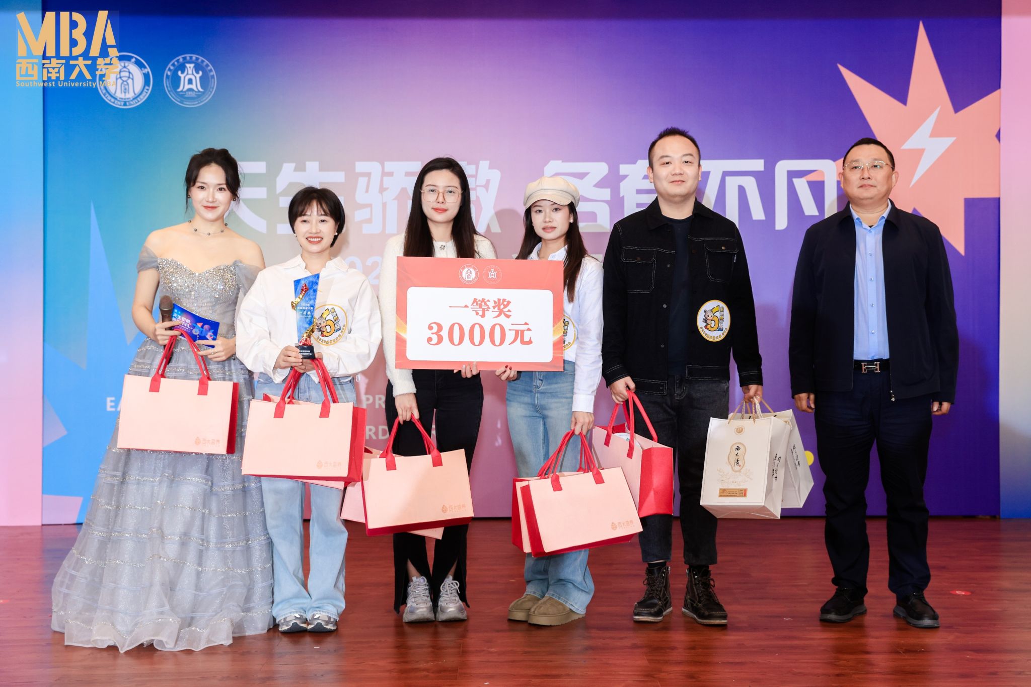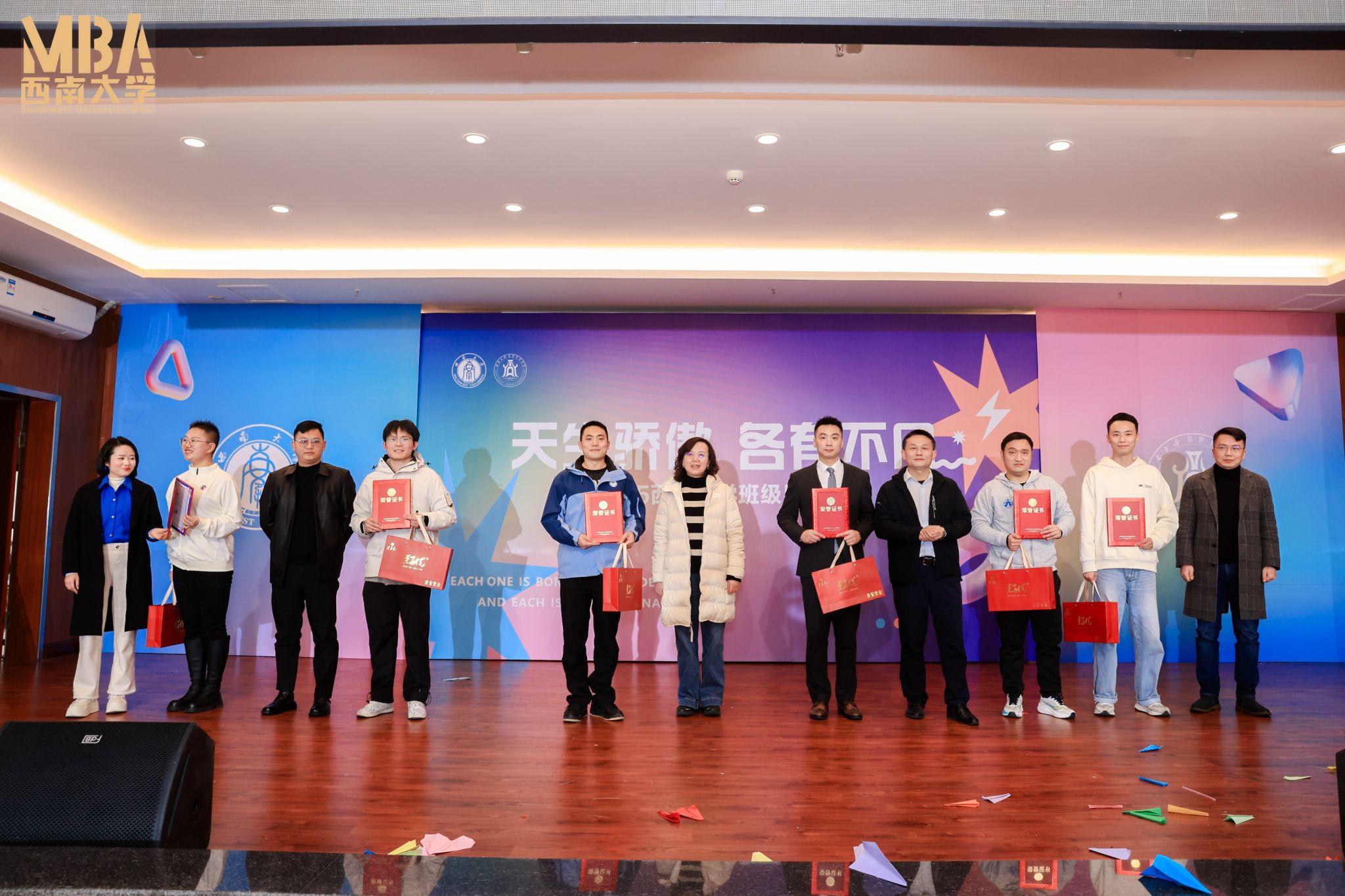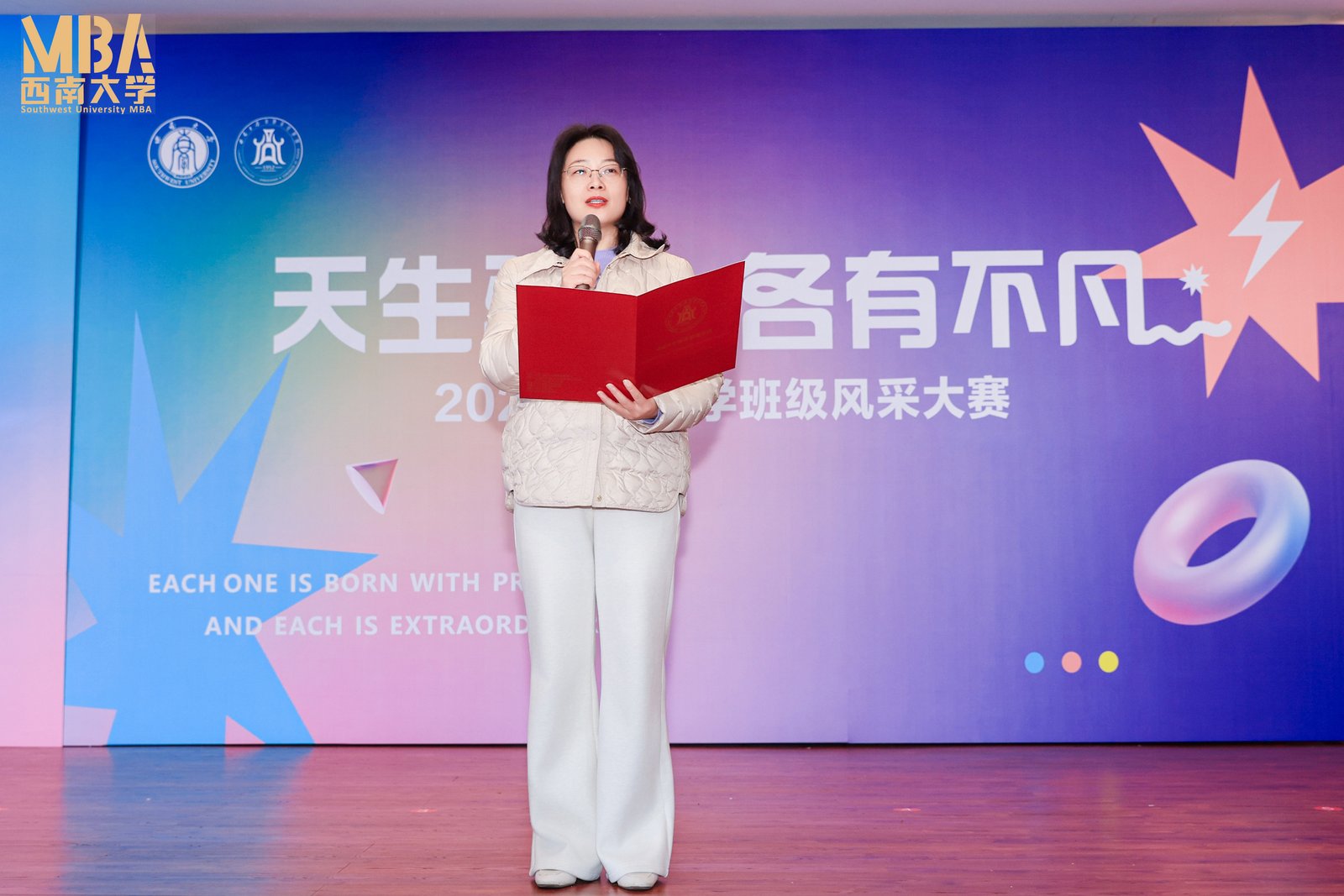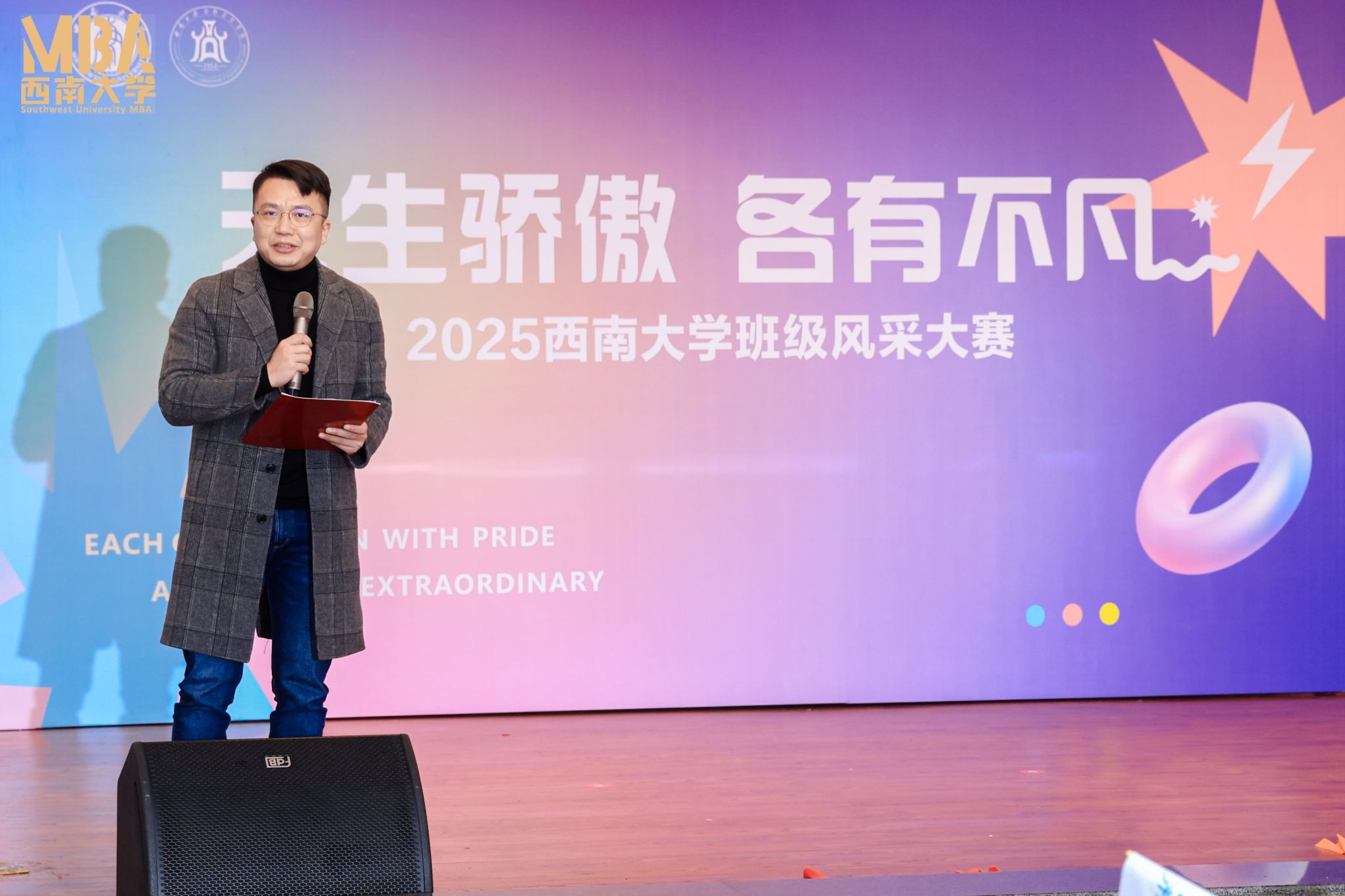 2025年12月21日,2025级MBA&MPAcc班级风采大赛“天生骄傲,各有不凡”在经管学院顺利举办。学院院长、党委副书记杨丹,党委副书记、纪委书记李玉胜,副院长黄庆华、刘新智,工商管理系主任甘晓龙,非全专硕教育中心副主任金绍荣、王双龙、刘向强,案例中心主任石声萍,西大情(重庆)酒业有限公司产品经理叶涛,西大盈养(重庆)生物科技有限公司总经理樊洁,以及非全专硕教育中心全体老师出席了此次活动。