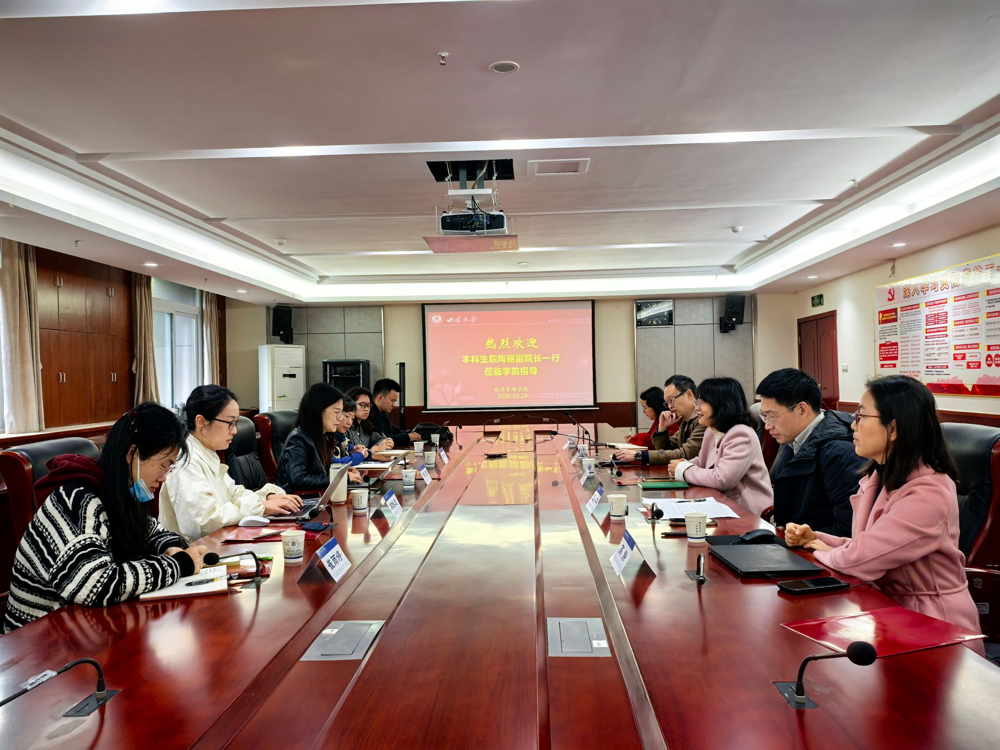 3月24日上午,学校本科生院副院长陶丽,本科生院教学研究与专业建设科科长邓怡迷及罗欢、崔雨婷老师一行莅临我院,调研指导农科类人才培养工作,并就进一步凝练总结我院农科育人特色与成效进行深入交流。学院院长杨丹、副院长王小华,专业建设办公室主任孔立、农林经济管理系主任高静、教学工作办公室主任胡华参加座谈。