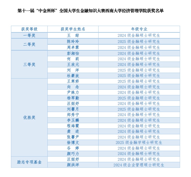 创立于2014年的“中金所杯”金融知识大赛,迄今已成功举办十一届,持续赋能高校金融学科建设、深化产教融合育人实践、推动金融国民教育普及,在全国高校金融专业领域具有高度权威性与广泛影响力。此次大赛所获优异成绩,充分彰显了西南大学经济管理学院硕士研究生扎实的理论功底、突出的综合素养与锐意进取的学术风貌,也是学院深耕人才培养质量、强化实战能力训练的生动体现。
