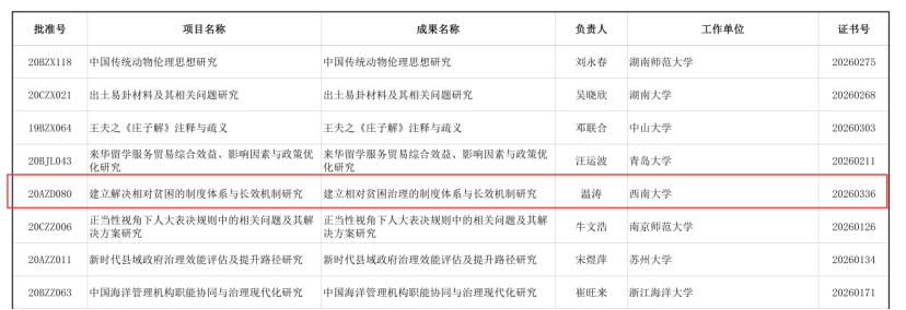 学院温涛教授主持的国家社会科学基金重点项目“建立相对贫困治理的制度体系与长效机制研究”(批准号:20AZD080),结题等级为“优秀”。