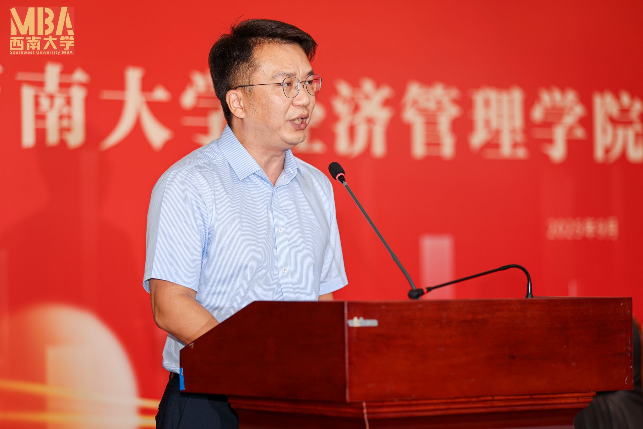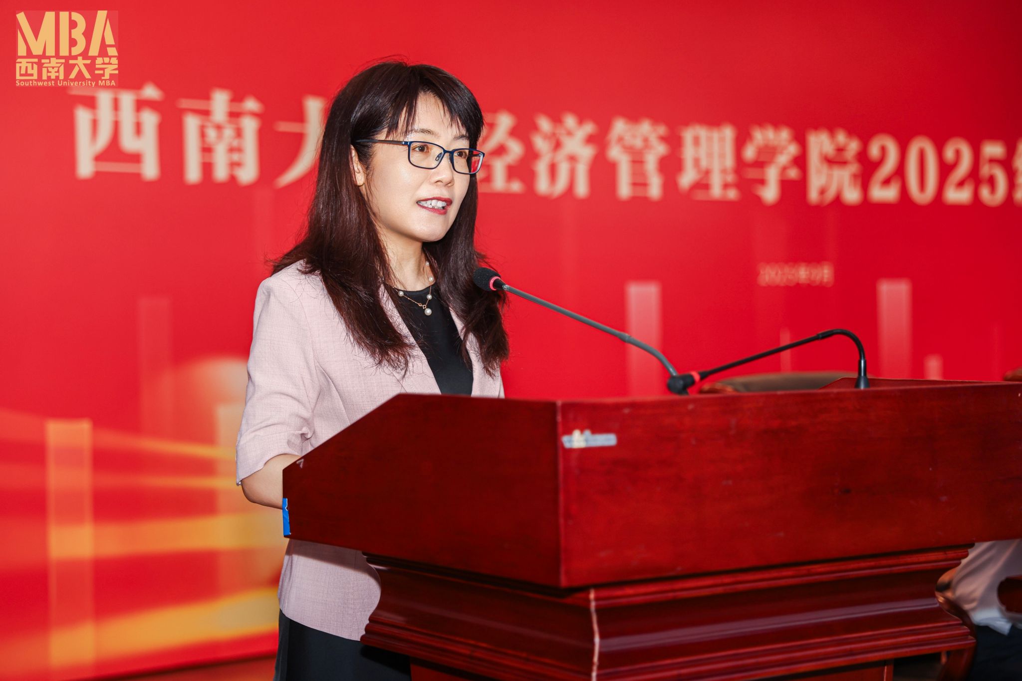 赵玉芳代表学校欢迎和祝贺2025级MBA、MPAcc、MTA全体新同学。她表示,作为教育部直属,教育部与农业农村部、重庆市共建的国家首批“双一流”建设高校,西南大学始终以服务国家战略、引领区域发展为己任,站在中国式现代化推进的关键节点,学校正紧扣时代需求,全力推进专业学位教育提质升级。她勉励同学们要扎根时代实践,践行知行合一,做服务发展的实干者,要拥抱变革创新,锤炼系统思维,做引领未来的开拓者,要秉持共创共享,强化团结协作,做担当使命的奉献者。她希望同学们珍惜学习机会,汲取百年西大的精神滋养,潜心治学、追求卓越,在高质量发展和民族复兴征程中书写精彩篇章。