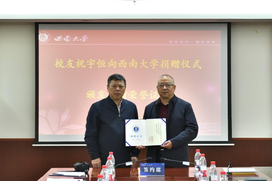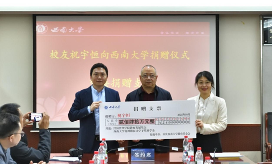 10月30日下午,西南大学经济管理学院1980级农业经济管理专业校友、贵州省西南大学校友会会长、贵州誉天下酒业有限公司董事长祝宇恒,以个人名义向母校捐赠240万元,这笔捐款既是他对求学时光的感恩回馈,更将成为母校120周年校庆的一份厚重献礼。