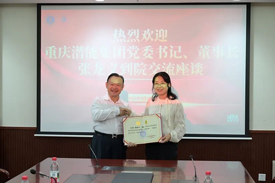 张龙义董事长系我院承办的重庆市工商联主席会长培训班学员,学院专业学位硕士研究生兼职导师。讲座开始前,学院院长杨丹教授为张龙义董事长颁发了兼职导师续聘聘书。