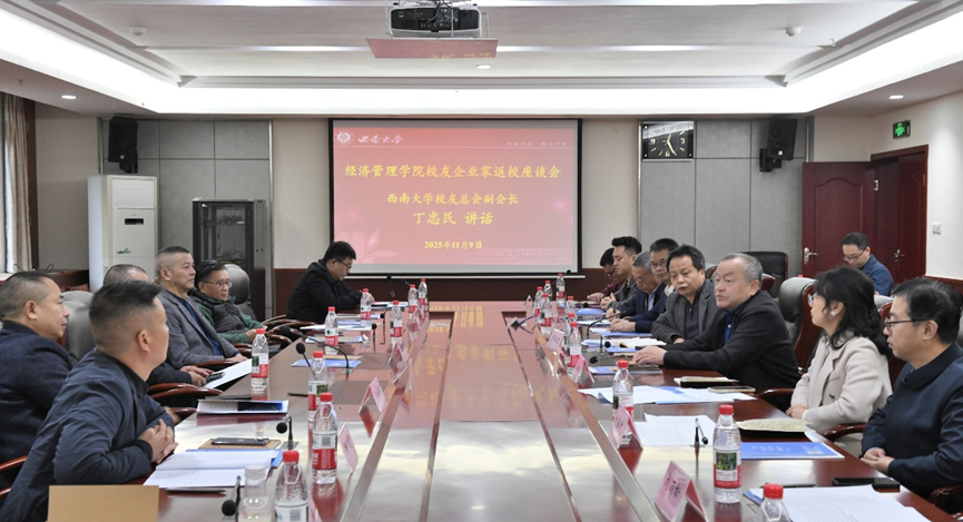 11月9日上午,学院以“经济管理学院校友工作高质量发展”为题举办了校友企业家返校座谈会,旨在汇聚校友智慧、凝聚校友力量,进一步深化校企合作与产学研融合,为学院与校友企业的共同发展注入新活力。西南大学校友总会副会长、学院&MBA校友会会长丁忠民,学院校友会副会长、副秘书长周一六、部分校友企业家以及学院领导班子出席本次座谈会。