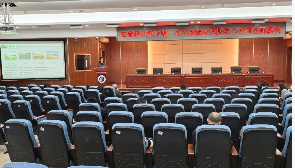 11月7日下午,学院“经管政声”第15期在B401报告厅顺利举行。学院黄国庆教授以《农文旅融合发展助力乡村全面振兴》为题,为全体教职工作报告。本次报告由学院党委书记卢跃进主持。